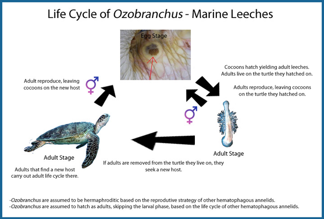 Ozobranchus (Marine leeches) are jawless leeches with a well developed, bell shaped anterior sucker. Infestations are readily apparent in areas where the dermis is thinnest, such as around the eyes, corners of mouth, and cloaca. Symptoms include weakness and lethargy due to loss of blood. Placing a sea turtle in a fresh water bath for 4-6 hours will remove adult leeches. Eggs must be scraped off or will hatch adults in 2-4 weeks.
