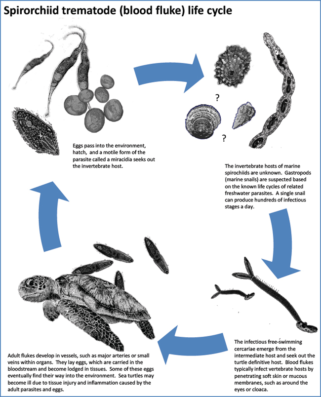 The life cycles of marine spirorchiids have yet to be discovered. This graphic is based on extrapolation from
